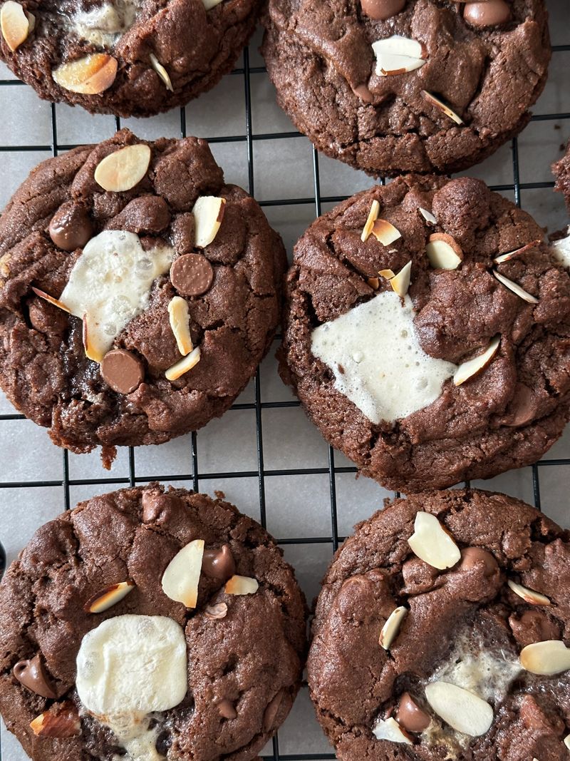 Rocky on the Road is a deep-dark chocolate cookie with ooey-gooey marshmallows with sliced almonds and dark chocolate chips. Let this cookie rock your world and take you on the road to paradise.