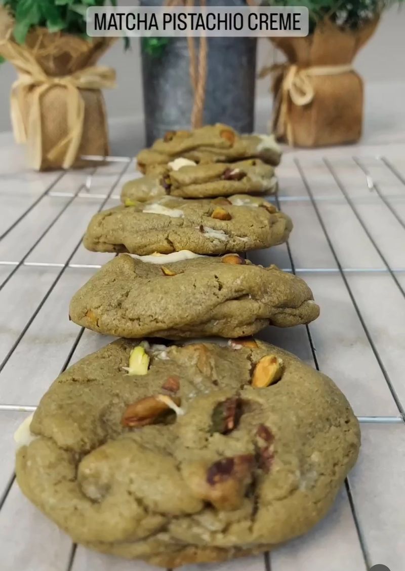 A matcha based cookie kissed with pistachios and entangled with a white chocolate crème.