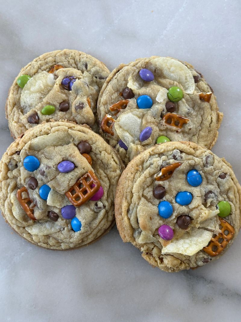 When you have the munches and not sure what to choose, our Lay it on Me cookie will satisfy your needs. Our cookie dough is infused with candy coated chocolate (with no dangerous dyes), pretzels, chocolate chips and topped with Lays potato chips.