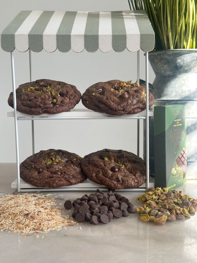 Delight in our Dubai inspired cookie. This decadent cookie is baked with a rich, chocolate-infused dough and loaded with layers of premium chocolate chips, roasted Kataifi and topped with crushed pistachios.