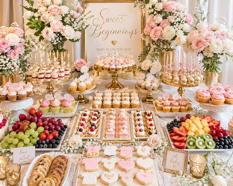 A beautifully arranged table filled with your choice of an assortment of mini pastries, cupcakes, cookies, and fruit sure to leave your guests in awe.
